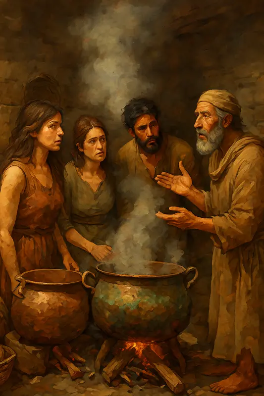 Rud, the Iran-ban, and her husband Zab fell ill multiple times from copper rust. In the end, once again, the admirable intelligence of Iran’s queen saved the remaining inhabitants of Sialk from annihilation: Rud realized that every time she cooked in earthenware she remained well, but when she cooked food in a copper vessel she became sick. Thus she resolved never again to cook food in copperware, and instructed the city’s survivors to cook only in earthenware. The people accepted her counsel, and they no longer cooked food in copper vessels.