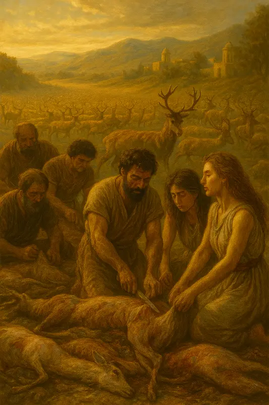 Never before had so many deer traveled in one immense mass; usually they went by separate herds, making slaughter difficult. This time, after the migration ended, the townsfolk sought to skin the carcasses—but there were too many. Soon the bodies rotted, and a stench filled Sialk.