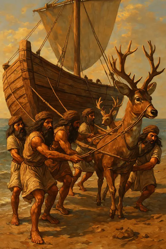 The vessel was being pulled by several deer walking through the shallow waters along the shore. From inside the boat came the melodious voice of a woman singing: